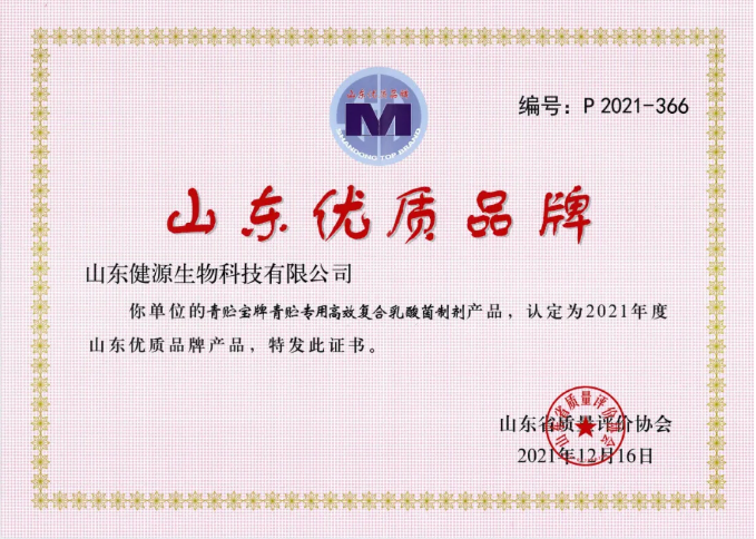 山東健源生物科技有限公司的“青貯寶牌青貯專用復合乳酸菌制劑產(chǎn)品”,被認定為2021年年度山東優(yōu)質(zhì)品牌產(chǎn)品。