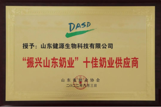 山東健源生物科技有限公司榮獲“振興山東奶業(yè)”十佳奶業(yè)供應商 稱號