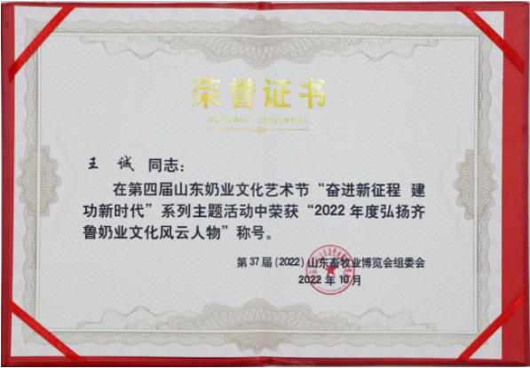 山東健源生物董事長王誠榮獲“2022年度弘揚(yáng)齊魯奶業(yè)文化風(fēng)云人物”稱號(hào)