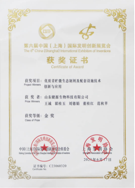 山東健源生物榮獲第六屆中國(guó)(上海)國(guó)際發(fā)明創(chuàng)新展覽會(huì)金獎(jiǎng)