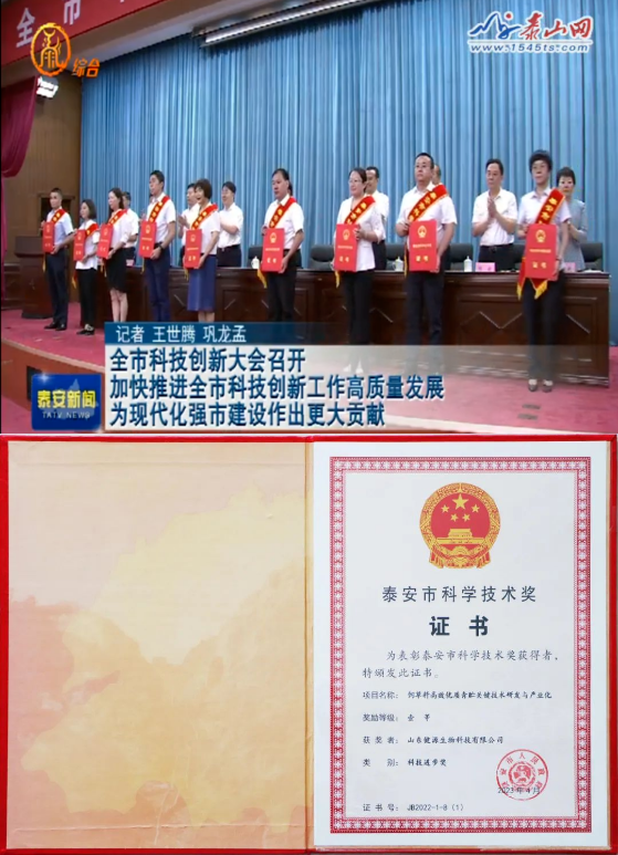 會議宣讀了泰安市人民政府《關(guān)于2022年度科學(xué)技術(shù)獎勵的決定》和《關(guān)于下達2023年泰安市科技創(chuàng)新“雙十工程”項目的通知》,并為2022年度科學(xué)技術(shù)獎獲獎代表頒獎。山東健源生物科技有限公司《飼草料高效優(yōu)質(zhì)青貯關(guān)鍵技術(shù)研發(fā)與產(chǎn)業(yè)化》項目榮獲泰安市科學(xué)技術(shù)進步獎一等獎。