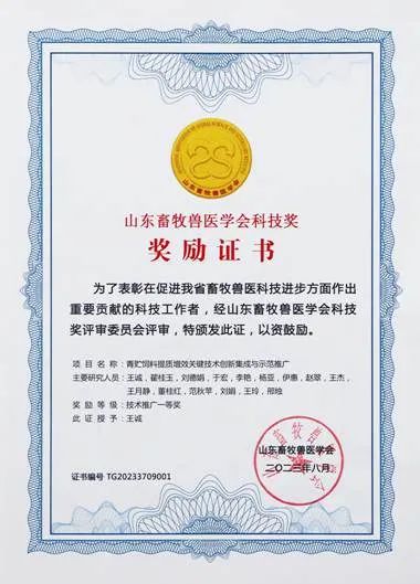 發(fā)布時(shí)間:[2023-9-18 14:34:45] 瀏覽量:5205次該獎(jiǎng)項(xiàng)由山東畜牧獸醫(yī)學(xué)會(huì)設(shè)立,根據(jù)《山東畜牧獸醫(yī)學(xué)會(huì)科技獎(jiǎng)獎(jiǎng)勵(lì)辦法(試行)》的規(guī)定,經(jīng)山東畜牧獸醫(yī)學(xué)會(huì)科技獎(jiǎng)勵(lì)工作委員會(huì)評(píng)審,對(duì)為我省畜牧獸醫(yī)事業(yè)科技進(jìn)步和創(chuàng)新做出突出貢獻(xiàn)的集體和個(gè)人給予的獎(jiǎng)勵(lì)。
