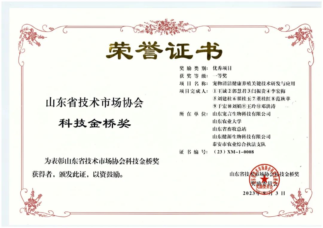 9月14日,2023年度山東省科技金橋獎表彰獎勵大會暨科技引領(lǐng)高質(zhì)量發(fā)展會議在濟(jì)寧任城區(qū)召開。山東健源生物有限公司與其下屬山東寵言生物科技有限公司共同完成的“寵物清潔健康養(yǎng)殖關(guān)鍵技術(shù)研發(fā)與應(yīng)用”項目,經(jīng)過專業(yè)組評審、評審委員會評審、獎勵委員會終審,最終榮獲山東省技術(shù)市場協(xié)會科技金橋獎優(yōu)秀項目一等獎。