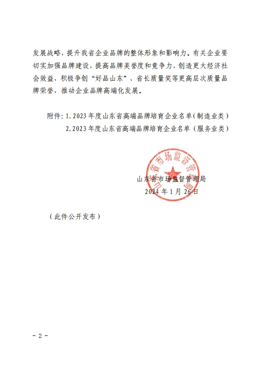 發(fā)布時(shí)間:[2024-2-4 8:44:32] 瀏覽量:3352次山東省市場(chǎng)監(jiān)督管理局主持開展的山東省高端品牌培育企業(yè)評(píng)選工作是培育質(zhì)量高、效益高、誠信度高、美譽(yù)度高的山東企業(yè)品牌,是深入實(shí)施質(zhì)量強(qiáng)省及品牌戰(zhàn)略,共建共享“好品山東”,加快推進(jìn)山東省品牌高端化進(jìn)程的一項(xiàng)重要工作。經(jīng)組織申報(bào)、資格審查、專家評(píng)審、綜合評(píng)價(jià)、結(jié)果審定等環(huán)節(jié),共有360家企業(yè)(含制造業(yè)300家、服務(wù)業(yè)60家)入選2023年度山東省高端品牌培育企業(yè)。