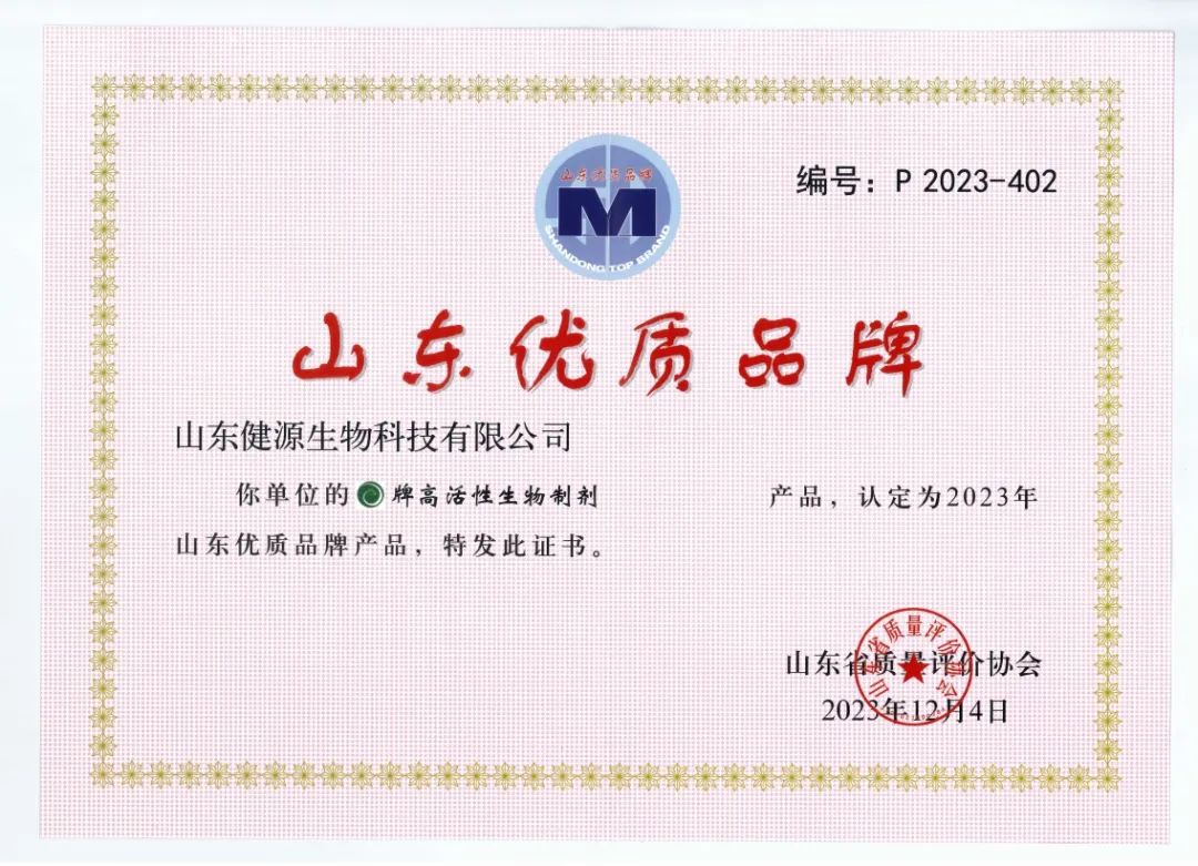 2023年12月,健源高活性生物制劑被山東省質(zhì)量評(píng)價(jià)協(xié)會(huì)認(rèn)定為2023年山東優(yōu)質(zhì)品牌產(chǎn)品。