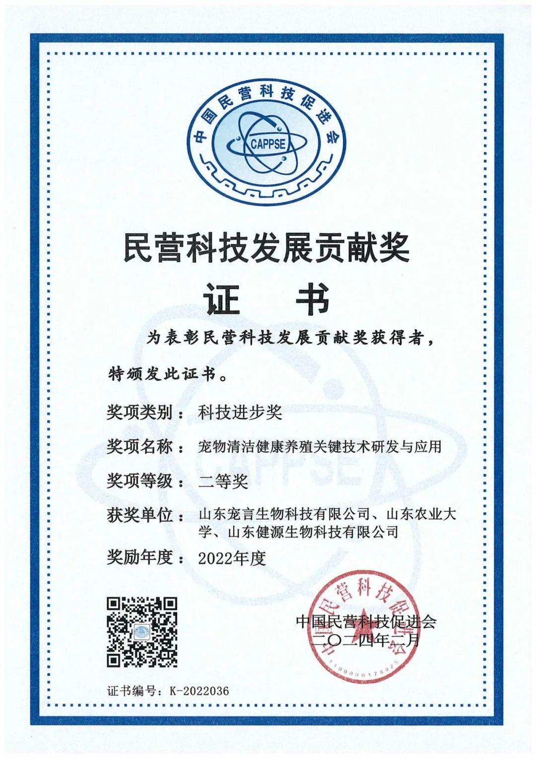山東健源生物科技有限公司及旗下山東寵言生物科技有限公司聯(lián)合山東農業(yè)大學共同完成的“寵物清潔健康養(yǎng)殖關鍵技術研發(fā)與應用”項目榮獲“2022年度民營科技發(fā)展貢獻獎科技進步獎二等獎”。
