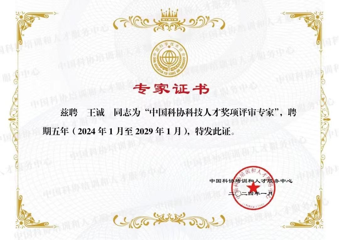 2024年1月被聘請(qǐng)為“中國(guó)科協(xié)科技人才獎(jiǎng)項(xiàng)評(píng)審專(zhuān)家”