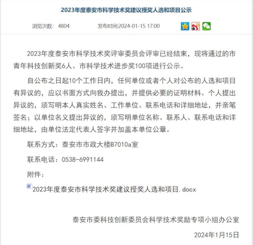 2023年12月榮獲“泰安市青年科技創(chuàng)新獎(jiǎng)”