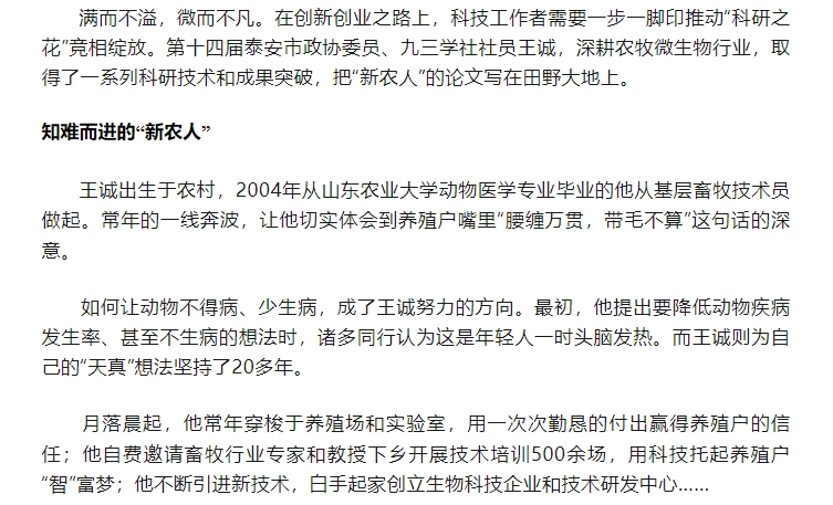 日前,王誠董事長接受了聯(lián)合日報記者的采訪,報道發(fā)表在2024年6月20日《聯(lián)合日報》3版,講述了王誠董事長作為“新農人”,20多年來深耕微生態(tài)領域,以高活性益生菌符合生物制劑技術為基點,從飼草料高效青貯、動物全消化道功能調控、養(yǎng)殖環(huán)境污染控制等方面開展全方位的發(fā)明創(chuàng)新,用專有發(fā)明技術助力農牧業(yè)高質量發(fā)展。而作為一名九三學社社員,王誠董事長堅持以“愛國、民主、科學和創(chuàng)新”的九三精神指導實踐,出色地完成各項工作。該報道同時被九三學社山東省委員會轉載報道。