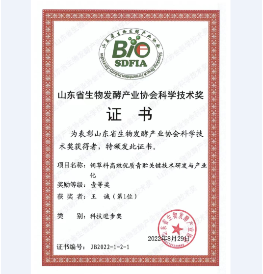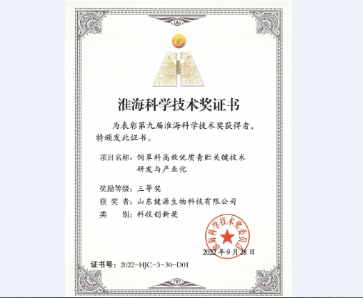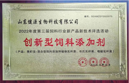 2022-11-1 祝賀山東健源生物(青貯寶)產(chǎn)品榮獲“2022年度創(chuàng)新型飼料添加劑”榮譽(yù)稱(chēng)號(hào)
