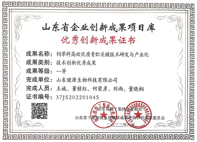 2022-7-15 山東健源生物榮獲山東省企業(yè)創(chuàng)新成果項(xiàng)目庫(kù) “技術(shù)創(chuàng)新優(yōu)秀成果一等獎(jiǎng)”