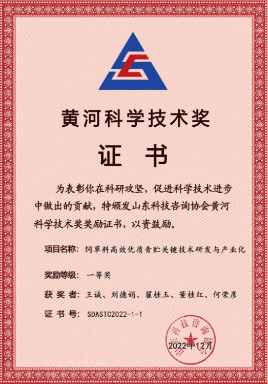2022年12月山東科技咨詢協(xié)會公布了2022年黃河科學(xué)技術(shù)獎評審結(jié)果的公告,經(jīng)專家評審會評審,現(xiàn)批準28個項目獲2022年山東科技咨詢協(xié)會黃河科學(xué)技術(shù)獎,其中一等獎3人,二等獎5人,三等獎20人。山東健源生物科技有限公司申報的《飼草料高效優(yōu)質(zhì)青貯關(guān)鍵技術(shù)研發(fā)與產(chǎn)業(yè)化》項目榮獲一等獎。