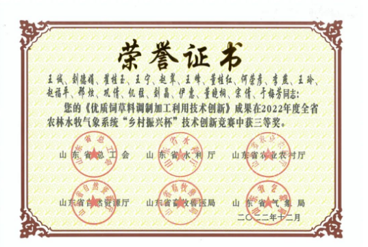 2023-7-15 山東健源生物榮獲2022年度全省農(nóng)林水牧氣象系統(tǒng)“鄉(xiāng)村振興杯”技術(shù)創(chuàng)新競賽三等獎